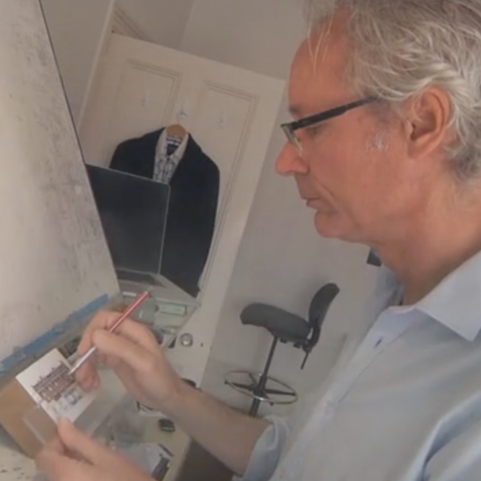 Every new series begins with extensive research trips across the country. On location he gathers detailed information: GPS data, architectural sketch studies, colour palettes, digital and 35 mm photography, as well as invaluable insights from locals who know their buildings best.